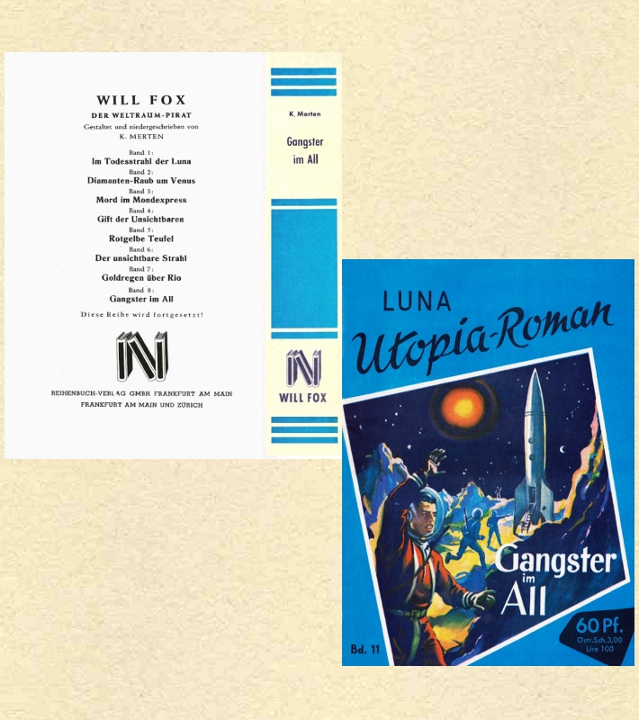 WILL FOX - Der Weltraum-Pirat # 8K. MERTEN[ HANNS KURTH (1904-1976) · alias Tom Larsen · alias C. C. Zanta · alias Edwin E. Möller (?) ]GANGSTER IM ALL Im Frühjahr 1980, am 16. März, um 17 Uhr, schrillte Fernalarm. Und dieser Alarmruf setzte sich fort und lief nicht nur durch Europa von Ost nach West, nicht nur um die ganze Erde, durch alle Kontinente, durch die Eisfelder der Antarktis und die Öden des Nordpols: der Alarm stieß wie ein Schrei über den Planeten Erde hinaus: Luna-City, die Kolonial-Station der Erde auf dem Trabanten Mond, fragte bei den Weltraumstationen der Erde zurück.Man glaubte auf Luna-City, man habe sich verhört. Das hatte die Erde, das hatte die Welt noch nicht gesehen und erlebt. Schließlich blieb auch im Jahre 1980 erste Weltmacht das Geld, das Gold.Edelmetalle, die man erst im Jahre 1965 zum erstenmal entdeckte, Grundstoffe, die in ihrer Hochwertigkeit auch im Jahre 1980 noch nicht übertroffen waren: nach diesen Dingen hatten Gangster ihre Hand ausgestreckt.Ein Verbrechen von einzigartiger Planung führte, als man den Spuren nachging, in den kosmischen Raum. Gangster im All waren an der Arbeit!Aber die Spuren verloren sich. Keine Spur mehr von den Tätern, keine Spur des Opfers! Man hätte glauben sollen, jene, die den Fall untersuchten, hätten die Affäre, den Mord, den Raub nur geträumt - wenn nicht die Täter einen Fehler, einen winzigen Fehler begingen, den klassischen Fehler der großen Gangster, der dann die Möglichkeit gab, ihnen nachzuspüren zwischen Erde, Mond und Planeten, auf der ersten Gangsterjagd im All, bei welcher niemand anders als der große Weltraumreisende Will Fox an der Spitze des Ringens stand.Aber waren seine Gegner nicht stärker als er? Brachten sie nicht Waffen und Mittel zum Einsatz, die auch ihm zum Verhängnis werden konnten?Will Fox hatte eine Mission übernommen und blieb seinem alten Schwur treu, nicht eher heimzukehren, als bis die Aufgabe gelöst sei, die er annahm... Diesmal jedoch war es schwerer als sonst. Diesmal ging es auf Biegen und Brechen, auf Leben und Tod. Ob er nicht doch unterlag? Ihm kam seine größte und stärkste Helferin in letzter Minute zur Seite. In geschickter Zusammenarbeit kamen sie dem Sieg näher - aber nur näher. Wie sie kämpfen mußten, um ihn endgültig zu erringen, das ist der Inhalt dieses Romans "Gangster im All" - ein Buch, das bis zur letzten Zeile fesselt wie selten ein Will-Fox-Reihenbuch.Impressum: © by Reihenbuch-Verlag GmbH., Frankfurt/M und Zürich · Gesamtherstellung: Hausenstein & Co., Friedberg i. H.REIHENBUCH-VERLAG GMBH FRANKFURT AM MAIN · Frankfurt a. M. und Zürich[ OA | 1953 | 248 S. (7-248) | 19 x 13,5 | Farb. ill. Supronyl m. SU: DM 6,80 | Reihe "WILL FOX - Der Weltraum-Pirat" Band # 8 - gestaltet und niedergeschrieben von K. Merten | mit Werbung für diese Reihe auf dem hinteren Buchdeckel | mit 4 Seiten Verlagswerbung für Abenteuerromane von Alan D. Smith und Tom Larsen ]Reihenbezeichnung: