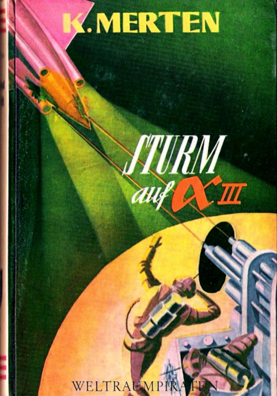 WELTRAUMPIRATEN / WILL FOX - Der Weltraum-Pirat | Band # 11K. MERTEN[ Hanns Kurth (1904-1976) · alias C. C. Zanta · alias Tom Larsen ]STURM AUF ALPHA IIIBei sensationellen Zwischenfällen und wichtigen Ereignissen widersprechen sich meist die Ausdeutungen der Tatsachen. So auch bei dem aufsehenerregenden Verschwinden des Weltraumfahrers Will Fox. Es gibt Leute, die behaupten noch immer, Will Fox hätte tatsächlich aus freien Stücken die Erde verlassen, um mit Yang Ling ein gemeinsames Leben zu beginnen, wogegen sich andere der Meinung anschließen, daß Will Fox keinesfalls freiwillig gestartet sei.Die bestürzte Weltsicherheitsbehörde sieht sich vor einer Kette unheimlicher Vorfälle; Anschläge gegen die bestehende Ordnung und alarmierende Raketenflüge unbekannter Mächte, die eigentlich auch den skeptischsten Männern der Weltpolizei deutlich machen müßten, daß der Kampf diesmal hart auf hart geht und daß der Weltraumfahrer Will Fox von den Gegnern ausgeschaltet wurde, damit sie ungestört gegen die Erdenregierung operieren können.Andererseits aber bleibt es rätselhaft, warum Will Fox nicht irgend ein Zeichen gibt; mit Recht ist die Bevölkerung empört, daß man immer noch keine Spuren von dem Vermißten gefunden hat. Doch die Allgemeinheit hat keine Ahnung - keine Ahnung von dem Überfall und dem Verlust einer Außenstation der Erde, von dem geheimen Waffenlager und Startplatz der Feinde in den Wäldern am Amazonas. Nur die Regierungsbehörden und ein paar wagemutige Männer wissen um die drohende Gefahr. Aber wie kann sich die internationale Regierung gegen einen Gegner wehren, der über wesentlich bessere technische Hilfsmittel verfügt?Wie die Erde dennoch vor dem verbrecherischen Überfall der sogenannten Interplanetarischen Mächte gerettet wurde, lesen wir in dem fesselnden Weltraumpiraten-Band "Sturm auf Alpha III".Impressum: © by Reihenbuch-Verlag GmbH, Frankfurt/Main. Prod.-Nr. 106. Gesamtherstellung: J. Ebner, Ulm/Donau. Titelblattgestaltung: Rolf Wansart, Frankfurt am Main.REIHENBUCH-VERLAG GMBH, FRANKFURT AM MAIN -FRANKFURT AM MAIN UND ZÜRICH[ DEA | 1953 | 256 S. | 19 x 13 | Farb. ill. Supronyl m. SU: DM 6,80 | Reihe "Weltraumpiraten" (Buch-Vorderseite) - "Will Fox - Der Weltraum-Pirat" (Band # 11) - gestaltet und niedergeschrieben von K. Merten (Buch-Rückseite) | mit Werbung für diese Reihe auf dem hinteren Buchdeckel ] +[ Bei diesem Supronyl-Band handelt es sich um eine Spezialausführung - die sogenannte "JO-BE-Buchdecke Ges. Gesch." - die Folie ist voll auf Buchdeckel und Rücken aufgeklebt (laminiert), ein Verfahren, das sich letztlich nicht durchgesetzt hat. ][ Reihenbezeichnung: