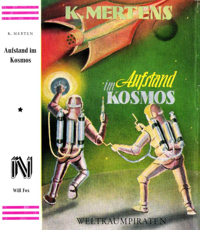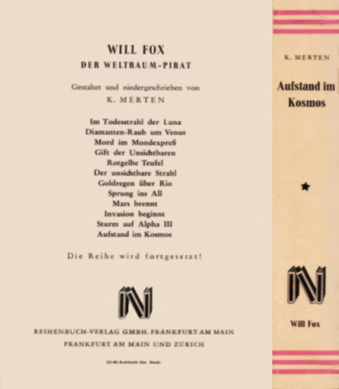 WELTRAUMPIRATEN / WILL FOX · Der Weltraum-Pirat | Band # 12K. MERTEN[ Hanns Kurth (1904-1976) · alias C. C. Zanta · alias Tom Larsen ]AUFSTAND IM KOSMOSZwischen Mars und Jupiter erstreckt sich der erst seit einigen Jahrzehnten bekannte Planetoidengürtel, eine Anhäufung kleiner Planeten des Sonnensystems, die zumeist auch für die schärfsten Teleskope nicht sichtbar werden. Hier befindet sich Alpha III, das Zentrum der Interplanetarischen Mächte, der Sitz des ehrgeizigen Gewalthabers Li Fu.Während auf dem Planetoiden Alpha III der gefangengehaltene Will Fox zwischen den gefährlichen Weltraumpiraten einem ungewissen Schicksal entgegensieht, startet Captain James Hunt mit dem wagemutigen Norbert Wells zu seiner Befreiung. Ein überraschender Zwischenfall auf dem Eisplaneten, wo Hunt auf die Spur eines vor Jahren entführten Wissenschaftlers trifft. Aber Hunt selbst gerät in die Gefangenschaft der rätselhaften Planetenbewohner.Die Verhältnisse zwischen Mars und Jupiter spitzen sich so weit zu, daß mit einer umwälzenden Veränderung innerhalb der Mächtekonstellation zu rechnen ist. Es gelingt den irdischen Persönlichkeiten, Will Fox und Captain Hunt an ihrer Spitze, die Entwicklung maßgeblich zu beeinflussen, wie weit sie sich aber dabei selbst in Todesgefahr begeben, wird sich erst zeigen."Aufstand im Kosmos" ist ein Weltraumpiratenband voller Rätsel und mitreißender Spannung. Diesmal wird der Stoß gegen die Zentrale der Weltraumgangster geführt. Doch der Gegner ist zu mächtig, auf welche Weise er noch einmal seiner völligen Vernichtung entgehen konnte, lesen wir in diesem Buch.Impressum: © 1953 by Reihenbuch-Verlag GmbH., Frankfurt/Main · Prod.-Nr. 113 · Graphische Gestaltung: Rolf Wansart, Frankfurt am Main · Gesamtherstellung: J. Ebner, Ulm/Donau.REIHENBUCH-VERLAG GMBH. - FRANKFURT / MAIN - FRANKFURT AM MAIN UND ZÜRICH[ OA | 1953 | 256 S. | 19 x 13,5 | Farb. ill. Klebefolienband (= "JO-BE-Buchdecke") m. SU: DM 6,80 | Reihe "WELTRAUMPIRATEN" / WILL FOX · Der Weltraum-Pirat" Band # 12 - gestaltet und niedergeschrieben von K. Merten | mit Werbung für diese Reihe auf dem hinteren Buchdeckel | Name des Autors auf dem Cover: K. Mertens ] +[ TG Katalog-65 | Illmer-186 | Serowy # 847-17 | ddb+ ]Reihenbezeichnung: