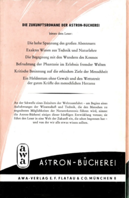 RICHARD KOCH [ 1895-1972! ] [ alias H. C. Nulpe ]MACHT AUS FERNEN WELTENDem deutschen Atomphysiker Thomas Christiansen läßt nach dem Krieg das drängende Verlangen keine Ruhe, einen Weg zu finden, um das Grauen von Hiroshima für alle Zeiten unmöglich zu machen. So will er ein Abwehrgerät konstruieren, das die Explosion jeder Atombombe verhindern soll - durch die Anwendung noch unerforschter Strahlen der Kernenergie.Mit zäher Beharrlichkeit geht er seinen Weg, und andere Männer - japanische und europäische Gelehrte, ein einsamer Arzt und ein abenteuernder Reporter werden in ein schicksalträchtiges Geschehen verwickelt, das in der geheimnisvollen Südseeinsel Varoa Motu sein Zentrum hat und bis nach Japan, Indonesien, Australien und Amerika Wirkung ausstrahlt. Die erregende Handlung gibt dem Buch die Spannung eines Abenteuerromans - aber die Hauptpersonen des Werkes sind zugleich durchdrungen von dem idealistischen Bemühen eines hohen moralischen Verantwortungsgefühls, das den Ausweg aus der feindseligen Machtpolitik sucht, die unsere Erde mit Vernichtung bedroht.Sicherlich sind auch in der Wirklichkeit der Gegenwart Forscher an der Arbeit, um wirksame Abwehrgeräte gegen die Waffen der Atomenergie zu erfinden - gewiß viel mehr, als wir Uneingeweihten ahnen - und es wäre durchaus denkbar, daß schon in naher Zukunft eine solche Lösung gefunden wird, wie sie der Autor des Buches durch seinen Roman vorwegnimmt. Zweifellos lebt in solchen Forschern - ebenso wie in Thomas Christiansen - jene innere Kraft, die stärker ist als tausendfacher Tod: der menschliche Geist, wenn er sein Streben auf die Erhaltung und Bewahrung des Lebens richtet und nicht auf dessen Zerstörung.AWA-VERLAG - E. F. FLATAU & CO. - MÜNCHEN 8[ NA (2. Auflage) | o. J. (1958) | 311 S. | 19,5 x 12,5 | Schwarzer Leinenband mit goldgeprägter Deckelvignette u. Rückentitel, mit farb. ill. SU: DM 6,80 | Reihe "Astron-Bücherei" | Umschlaggestaltung: Hannes Limmer, München | mit Verlagswerbung für das Buch "Einen Mann für Mama" von Inge Rösener | mit Klappentext für den Roman "Flammende Erde" von Richard Koch auf der rechten SU-Klappe | Cover-Abbildung und Klappentext von dieser Ausgabe! - die bei Illmer als EA von 1956 gelistet ist (jedoch ist das möglicherweise nicht korrekt ] +=[ EA | o. J. (1956) | Titel: "Macht aus fernen Welten" | Titelzusatz auf Cover: "Das Rätsel von Varoa Motu" | 8° | 311 S. | Ln m. SU: DM 12,80 ][ Welche der beiden Ausgaben die Erstausgabe ist, ist leider nicht eindeutig. Mit ziemlicher Wahrscheinlichkeit ist die Ausgabe mit "Astron-Bücherei" auf dem Cover die (nicht gekennzeichnete) 2. Auflage ][ TG # 1 - 1957 (EA/12,80) | TG # S - Aug 1958 (2. Auflage/6,80) | Illmer-154 (1956/Astron-Bücherei) | Serowy # 682-10 | ddb+ ]Rezensionen / Materialien:
