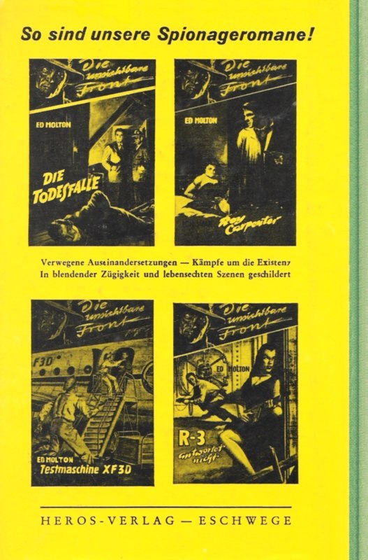 ED MOLTON [ Verlagspseudonym ]SKAPAROFFS FLUCHT[ Ein Chris-Stamper-Roman ][ Serie "Die unsichtbare Front - Spionage · Sabotage ·Verrat" ]Colonel Baxter hatte einen Spezialauftrag für seinen Staragenten Stamper. Ein Wissenschaftler aus einem östlichen Land hat einen in den Staaten lebenden Verwandten aufgefordert, ihm zur Flucht zu verhelfen, wenn er an einer wissenschaftlichen Tagung in Toronto teilnimmt.Chris Stamper ist voller Mißtrauen. Er wittert eine Falle. Trotzdem fliegt er nach Tokio, wo die Wissenschaftler Station machen. Doch hier geschehen Dinge, die er nicht klären kann. Er wird beschattet und muß sich als japanischer Sumokämpfer verkleiden.Der Mord an seinem Freund Philip Long, dem Vertrauensmann der amerikanischen Abwehr in Tokio, ist eine Folge der Zusammenkunft mit Stamper. Die japanische Polizei hält Stamper für den Mörder und verfolgt ihn. Doch er kann den Irrtum aufklären. Was er an Unterhaltungen zwischen den zu beobachtenden Wissenschaftlern belauscht, interessiert ihn sehr.Er erfährt, daß sie es mit der Zusammenarbeit nicht ganz ernst nehmen.Es gelingt ihm, den Mann zu finden, der die Flucht wagen will. Doch erst in Toronto kann er mit ihm sprechen. Er erfährt die Hintergründe und verspricht zu helfen.Die Flucht gelingt, nachdem Chris Stamper einige der Spione festgenommen hat.Impressum: Heros-Verlag - Eschwege · Alle Rechte vorbehalten · Gesamtherstellung: Rud. Gottlieb, Bramsche · AKTION 57 · Das gute Unterhaltungsbuch.HEROS-VERLAG · ESCHWEGE[ OA | o. J. (1958-1960) | 271+1=272 S. | 18,5 x 12,5 | Farb. ill. Supronyl | Reihe "Die unsichtbare Front" | Mit Werbung für diese Reihe auf dem Backcover (siehe Cover 2) ] +[ Hethke/Skodzik 9. Aufl. 2007-515 (up) ]Materialien / Rezensionen:
