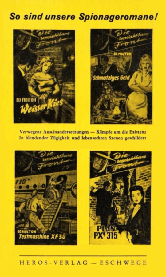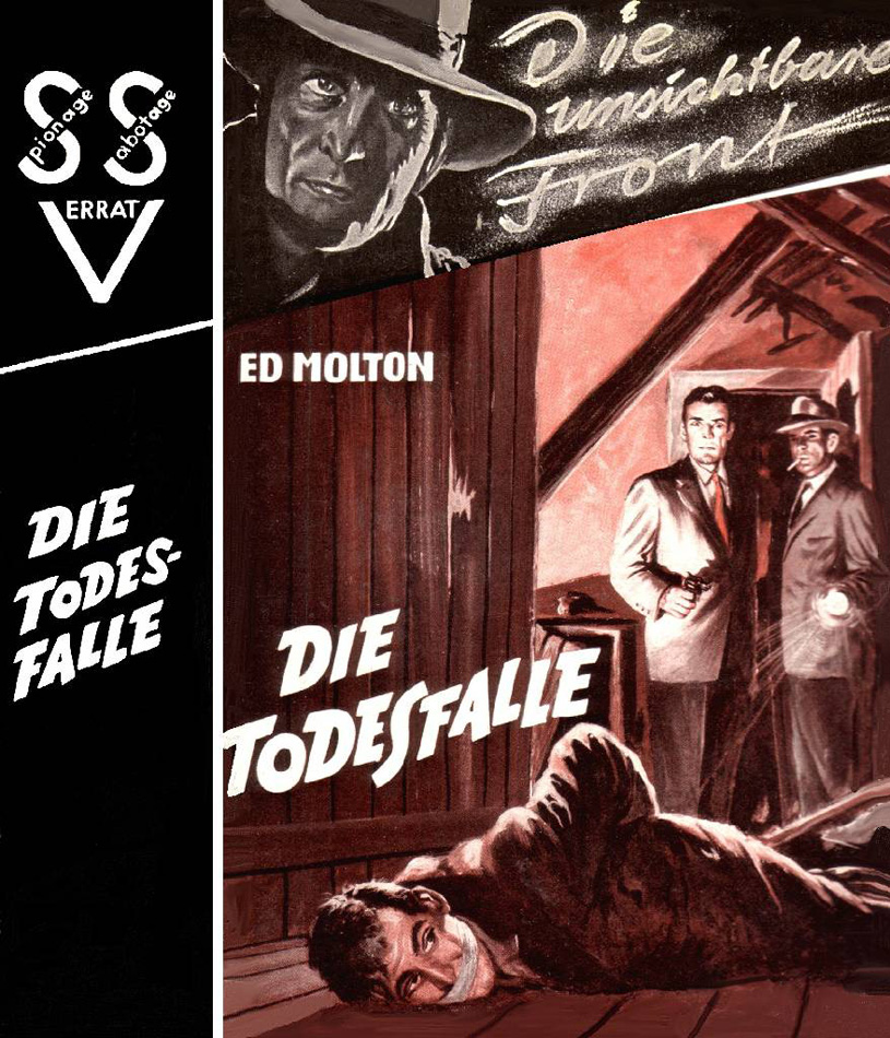 ED MOLTON [ Verlagspseudonym ]DIE TODESFALLE[ Ein Chris Stamper Spionageroman ][ Serie "Die unsichtbare Front - Spionage · Sabotage · Verrat" ]Ahnungslos besteigt Frank Lonsdale die planmäßige Maschine Paris-Ankara. Er ist Kurier im Außenministerium und hat wichtige Geheimdokumente in seinem Kurierpostsack bei sich. Er soll Ankara nicht erreichen. Drei Männer und eine Frau überwältigen die Besatzung der Maschine und zwingen sie in der Wüste bei Tunis zur Landung. Frank Lonsdale wird entführt. Sein Verschwinden alarmiert den Geheimdienst.Da auch Lonsdales Braut am gleichen Tage von Unbekannten entführt wird, befürchtet Chris, daß die Geheimdokumente in die Hand von Agenten gefallen sind. Er fliegt nach Paris, um hier die Spur aufzunehmen. Doch bevor er etwas erreicht, verschwindet in Madrid ein zweiter Kurier: Fred Bliss.Stamper steht vor einem Rätsel. Welches Land wagt es, gegen die internationalen Abmachungen zu verstoßen und Kuriere zu überfallen? In Madrid findet er eine erste Spur. Ein Reporter und Miß Yeager spielen eine Rolle. Die Frau entkommt, nachdem der Reporter ermordet wurde. Doch Chris lernt einen ihrer Lieferanten kennen und erfährt, daß sie sich nach Paris gewandt hat. Er kehrt zurück und läßt nach der Frau suchen, die unter vielen Namen lebt. Es gelingt ihm, sie festzunehmen. Aber da ruft ein Unbekannter an und fordert die Freilassung, anderenfalls Fred Bliss ermordet werden soll. Chris Stamper geht auf diese Ankündigung ein.Aber nun sind viele Mitglieder der Bande bekannt. Chris Stamper durchschaut ihr Treiben. Er jagt die Agenten. Das Ende spielt im Forschungszentrum von Oak Ridge, wo die Agenten ihren größten Coup landen wollen.Impressum: Heros-Verlag, Eschwege · Alle Rechte vorbehalten · Gesamtherstellung: Rud. Gottlieb, Bramsche · Aktion 57 - Das gute Unterhaltungsbuch.HEROS-VERLAG · ESCHWEGE[ OA | o. J. (um 1959) | 271+1=272 S. | 18,5 x 12,5 | Farb. ill. Supronyl m. SU | Reihe "Die unsichtbare Front · Spionage Sabotage Verrat" | mit Werbung für diese Reihe auf dem hinteren Buchdeckel (siehe Cover 2) ] +[ Hethke/Skodzik 9. Aufl. 2007-515 (up) | ddb+ ]Materialien / Rezensionen:
