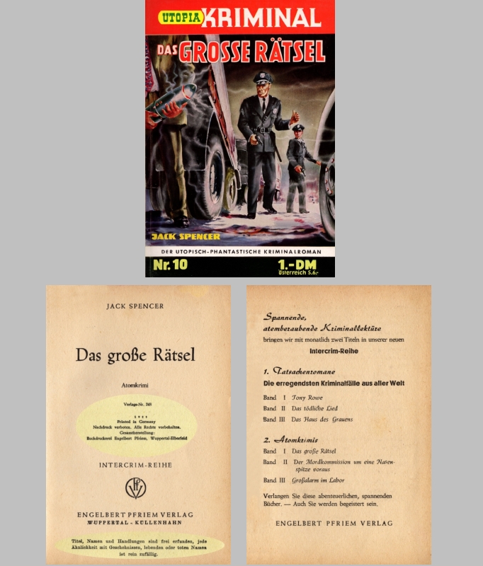 • "ATOMKRIMIS" nannte der Engelbert Pfriem Verlag eine dreibändige Serie von "Jack Spencer" (richtiger Name unbekannt), die 1955 erschien: Untertitel der Serie "Die erregendsten Kriminalfälle aus aller Welt". Wie leichtfertig damals bei Nachdrucken mit den Leihbuchoriginalen bzw. mit der Autorenangabe umgegangen wurde, zeigt die Nachdruckgeschichte der dreibändigen Serie. Alle drei Romane wurden vom Pabel-Verlag in der Reihe UTOPIA-KRIMI bzw. später UTOPIA-KRIMINAL nachgedruckt.