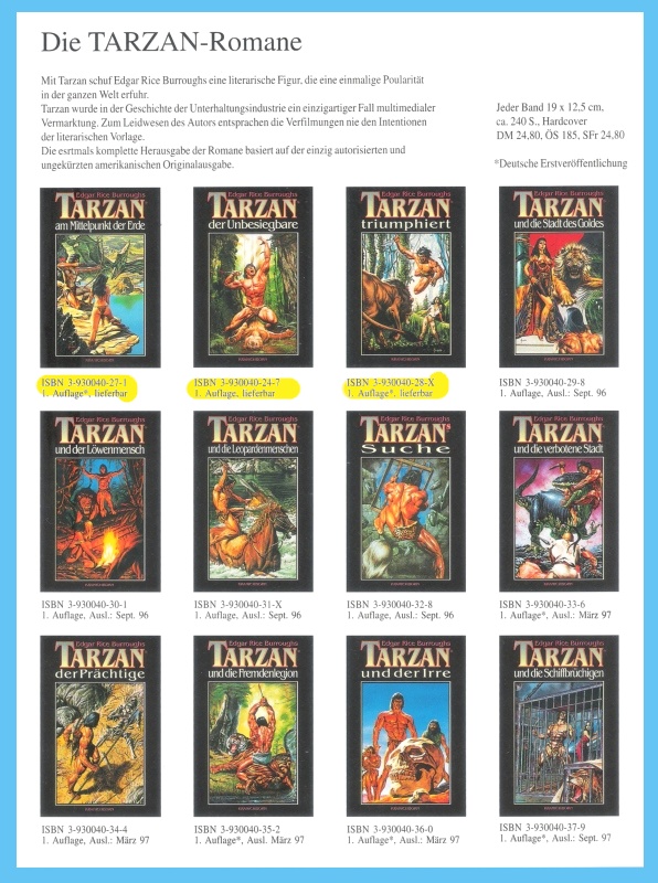EDGAR RICE BURROUGHS [ 1875-1950 ]TARZAN UND DER LÖWENMENSCHEinen wirklich echten Filmstreifen in Zentralafrika zu drehen, ist die Absicht einer Expedition, die von Amerika aufgebrochen ist und sich den unvorstellbaren und nicht geringen Schwierigkeiten unterwirft, um den technischen und künstlerischen Apparat an Ort und Stelle zu bringen.Moskitos, Fieber, der Dschungel, Steppen, Wüste und Durst, aber auch die in einer sagenhaft primitiven Anschauungswelt lebenden Einwohner des Landes stellen sich der Expedition entgegen. Intrige und Zwist tun das Ihrige.Die Expedition zerfällt und wird von den Eingeborenen in alle Winde verschleppt. Da aber greift Tarzan, der Unbestechliche und Unbesiegbare ein. Und wir treffen sie alle wieder, unsere guten Freunde um den bronzebraunen Herrn des Dschungels. Nkima, das Äffchen, die Tiere der Wildbahn und die schwarz- und braunhäutigen Dschungelbewohner in ihrer Anhänglichkeit und Grausamkeit.Schöne Frauen und eine Bande, grausame Araber und ein halbverrückter Wissenschaftler, der sich damit befaßt, einem Gorillastamm menschliche Sprache beizubringen, stellen die Hauptfiguren des an Spannung überreichen Geschehens.Man muß diesen Bericht von Tarzan gelesen haben, um am Schluß mit Befriedigung festzustellen: Tarzan ist und bleibt einmalig.Impressum: Gedruckt 1955 by PEGASUS VERLAG, Wetzlar · Titel des englischen Originals: Tarzan and the Lion Man · Ins Deutsche übertragen von Helmut H. Lundberg · Schutzumschlag: Heinz Gerster, Wetzlar · Gesamtherstellung: Kleins Druck- und Verlagsanstalt GmbH., Lengerich (Westfalen).PEGASUS VERLAG · WEZTLAR[ DEA | 1955 | 251+1= 252 S. | 19 x 13 | Ln m. farb. ill. SU: DM 6,80 ++ Farb. ill. Supronyl: DM 6,80 | Reihe "Tarzan" # 16 | mit 3 Seiten Verlagswerbung ] =[ Illmer-66 (falscher Titel: "Tarzan und die Löwenmenschen") | ddb+ ]