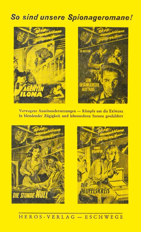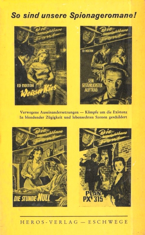 DIE UNSICHTBARE FRONTSPIONAGE · SABOTAGE · VERRATSo sind unsere Spionageromane! · Verwegene Auseinandersetzungen · Kämpfe um die Existenz · In blendender Zügigkeit und lebensechten Szenen geschildert.In den Jahren 1958-1960 erschienen in der Verlagsbuchhandlung H. Bethke und später im Heros-Verlag, Eschwege 20 Romane der Spionageroman-Reihe "Die unsichtbare Front - Spionage · Sabotage · Verrat".» . . . Der Leser erfuhr in den Romanen, wie sich der Kampf der Spione und Agenten im Dunkeln abspielte, wie sie sich an der "unsichtbaren Front" belauerten. Die ersten Abenteuer stammen aus der Feder von "Ed Morell" (d. i. Erwin Banzhaf), weitere Titel schrieb "K. W. Browne" (d. i. Joachim Rennau) und "Ed Molton". Bei diesem Namen handelt es sich nach meiner Meinung um ein Sammelpseudonym, wobei ich den spannenden Titel "Die Stunde Null" für eine J. Rennau-Arbeit halte. Ich vermute, daß mindestens drei Autoren unter dem Pseudonym "Ed Molton" schrieben. In zehn dieser Bände ist der Hauptheld "Chris Stamper", der einen gefährlichen Kampf an der "unsichtbaren Front" führt . . . «(Siegfried Schmidt: "Die unsichtbare Front" in "MAGAZIN für Abenteuer-, Reise- und Unterhaltungsliteratur" # 61 · 1. Quartal 1989 · Seite 24-25).Etwa die Hälfte der Titel sind im "Roman-Preiskatalog" von Norbert Hethke & Peter Skodzik (9. Auflage: 2007) als utopisch-phantastisch aufgeführt.Die Titelliste (up-Titel sind fett gedruckt):