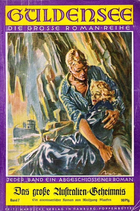 WOLFGANG MARKEN[ Fritz Mardicke (1895-1966) ]DAS GOSSE AUSTRALIEN-GEHEIMNISEin großes Geheimnis umgibt den Herrn der Südseeinsel Selhi. Woher stammt sein ungeheurer Reichtum? Und ist Sir Albert sein richtiger Name? Wer ist die Frau, die mit ihm auf der Insel lebt? Und warum nehmen beide so lebhaften Anteil an Heli, der jungen Engländerin, die durch Zufall ihr Gast wird? Wer ist der verbrecherische Pirat Cherby, aus dessen Klauen Sir Albert sich nur mit Mühe retten kann? Und wer verbirgt sich unter der Maske Sir Kents, der als einer der wichtigsten Geheimagenten des englischen Weltreiches gilt. Was bezweckt Momme, ein junger Schwede, mit seinen Expeditionen in die Sandwüsten Australiens? Wer sind die Insassen des Unterseebootes, das einer Naturkatastrophe zum Opfer fällt? Was hat es mit Goldenhall auf sich, der Schatzhöhle? Und wo findet man den Eingang zu ihr? Fragen über Fragen türmen sich vor dem Leser auf und finden überraschende nicht vorhersehbare Beantwortung. Mit steigender Spannung nimmt man teil an dem Schicksal schöner Frauen, an dem Kampf tapferer Männer. Wolfgang Marken hat einen Roman um Ereignisse geschrieben, wie sie abenteuerlicher nicht geschehen können.Aus der Reihe der "Meister-Romane" - MEISTER VERLAG - ROSENHEIM[ NA | o. J. (1955) | 303+1=304 S. | 19 x 13 | Farb. ill. Supronyl -- HLn m. farb. ill. SU: DM 6,80 | Gedruckt in Fraktur | Titel auf dem Cover, dem Buchrücken und im Klappentext: "Das große Australien-Geheimnis" - auf der Titelseite: "Das Australien-Geheimnis" ] +[ Die Erstausgabe ist im Jahr 1936 unter dem Titel "Das große Australiengeheimnis" im Fritz Mardicke Verlag, Hamburg erschienen (HC, 8°, 311 S.). ][ Bloch # 2045 ]