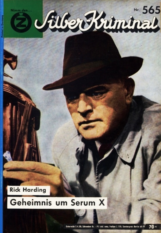 RICK HARDINGSERUM X[ Ein Nat-Bull-Kriminalroman ]Kriminalroman um eine Erpressung mit einem tödlichem Serum mit minimalem utopisch-phantastischen Gehalt.Nat Bull. Oder Captain Jonathan Bull, das beste Pferd im Stall des US-Geheimdienstes CIA. Klar, daß ein solcher Mann immer da zu finden ist, wo scheinbar unlösbare Fälle zu lösen sind.Diesmal finden wir ihn in der Riesenstadt New York. Ihn und seinen schurrbärtigen Freund Archibald Londonderry, der nicht halb so steif und unbeweglich ist, wie es auf den ersten Blick aussieht. Was ein Mitglied des englischen Geheimdienstes ausgerechnet in Amerikas größter Stadt zu suchen hat?Nun - ein englischer Professor, der in New York arbeitet, ist verschwunden. Entführt - sagen die einen. Untergetaucht - meinen andere. Oder tot - ermordet? Vielleicht ist es auch ein Selbstmord?Über 10 000 Menschen verschwinden jährlich in New York. Die meisten werden wiedergefunden. Dafür ist die bewährte Spezialabteilung der City Police zuständig.Was hat also der Geheimdienst zweier Staaten damit zu tun? Sir Thomas, der englische Professor, ist ein wichtiger Mann. Nur er besitzt das Geheimnis des "Serum X", und wenn er nicht gefunden wird, werden innerhalb von Stunden fünf Menschen sterben. Auch seine eigene Tochter . . .Mehr wird nicht verraten - folgen Sie Nat Bull und Archibald Londonderry nach New York, wo die beiden ihre bisher härteste Nuß zu knacken haben.Achtung!! Nicht vor dem Schlafengehen lesen!!!Impressum: Alle Rechte vorbehalten · SABA=Bücher · Verlag: Schälter & Co., Hemer-Sundwig.SABA-BÜCHER im Verlag Schälter & Co. · Hemer-Sundwig[ OA | o. J. (ca. 1964) | 255+1=256 S. [5-129,132-256] | 18,5 x 12,5 | Farb. ill. Supronyl: DM 7,60 | mit Werbung für Romane des CIA-Agenten Nat Bull auf Seite 130-131 ] +up laut: