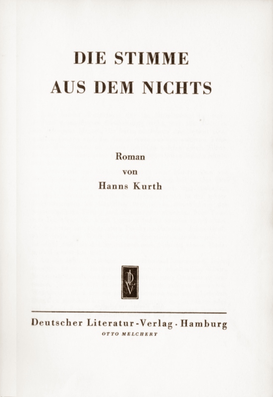 HANNS KURTH[ (1904-1976) · alias Tom Larsen · alias K. Merten · alias C. C. Zanta · alias Edwin E. Möller (?) ]DIE STIMME AUS DEM NICHTSIm Dunkel legendenumsponnener schottischer Schlösser und in den weiten nebligen Heiden wurde ein Junge groß, dem das Geschick eine hellsichtige Mutter bescherte. Es war alles ein wenig seltsam, was um ihn herum geschah. Doch als diese Mutter krank verdämmerte, flüsterte sie, sie werde immer um ihn sein, wenn er nach ihr rufe; und auch sonst, wenn er in Gefahr gerate.Das war die Stimme aus dem Nichts, die er hörte und die ihn lenkte - bis er fast seine Seele verlor nach einer weltweiten Wanderung und Irrfahrt. Irgendwo in einer engen Straße in Schanghai wartete das Schicksal auf ihn. Dort rief die Stimme zum letzten Male. Aber bis dahin war es ein weiter Weg voller Abenteuer und Liebe; aber ganz anders, als sie sonst dem Menschen begegnet. Denn über allem lag der gleiche zarte Hauch einer Mutterseele, die ihren Sohn suchte und lenkte - bis seine Zeit erfüllet war.Impressum: Deutscher Literatur-Verlag, Otto Melchert, Hamburg · Alle Rechte vorbehalten · Druck und Einband Saladruck, Berlin · Printed in Germany 1950.DEUTSCHER LITERATUR-VERLAG · HAMBURG[ Buch-OA | 1950 | Halbleinenband m. farb. ill. SU | 365 S. | mit einer Seite Verlagswerbung ] +[ Bloch² # 1817 | TG Katalog-56 | Serowy # 707-1 | dnb+ ]