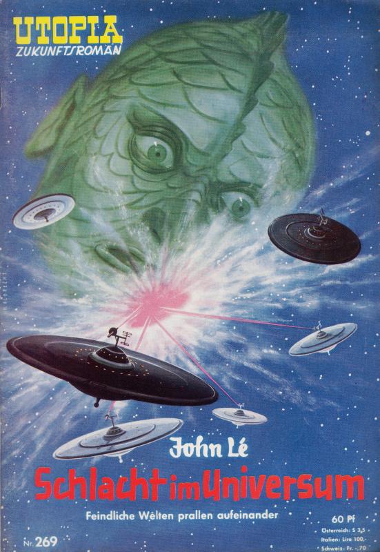 GERT SANDOW[ G. / G. J. / J. G. / Gerd / Gert Sandow = Joachim Puhle (*1929) ]WETTERLEUCHTEN ZWISCHEN DEN STERNEN[ 2. Buch der Trilogie "Kampf um die Milchstraße" ]Sie haben keine Chance gegen die Ghorogs. Zwar ist die Erde noch nicht unmittelbar bedroht, aber nur die Tellusier vermögen in dem fast aussichtslosen Kampf gegen den unmenschlichen, kompromißlosen Feind aus der fremden Galaxis eine Wende herbeiführen, falls überhaupt jemand.Deshalb jagt durch die kosmischen Weiten der Funkspruch: "THYRNA RUFT TELLUS - - -". Und die Galaxone Thyrnas landen wiederum auf der Erde, diesmal aber als willkommene Freunde, um das "Freicorps Tellus" an Bord zu nehmen.Das Rätsel beginnt schon am Mars. Noch keiner ahnt, daß hier der Schlüssel für den ganzen Krieg liegt. Und auf der Reise nach Thyrna erleben sie die erste böse Überraschung. Die gesamte Intergalaktische Föderation befindet sich in Panikstimmung, denn eine Welt nach der anderen fällt dem unheimlichen Gegner zum Opfer.Auch der kampfesmutige Einsatz der Terraner, an der Spitze Prof. Conti und Dr. Taylor, Harald de Vainqueur und Jochen Fugger mit seiner Frau, scheint erfolglos. Sie selbst werden zu den Waffenschmieden Thyrnas, und doch - nichts scheint zu nützen.Der KAMPF UM DIE MILCHSTRASSE scheint schon entschieden, da werden Fugger und seine Freunde aus Thyrna und Tellus vermißt gemeldet, und da geschieht es . . ."Wetterleuchten zwischen den Sternen", ein in sich abgeschlossener Roman aus der meisterhaften Feder unseres Autors SANDOW, und doch nur der zweite Teil des "KAMPFES UM DIE MILCHSTRASSE", dessen dritter Teil "Patrouille der Zeitlosen" erst die Entscheidung in wahrhaft verblüffender Form bringt . . .BEWIN-VERLAG / B. WINTERBACH K.G. · Menden/Sauerland[ ÜNA | o. J. (1964) | 253 S. | 18,5 x 12,5 | Farb. ill. Supronyl m. SU: DM 7,60 | mit einer Werbeseite für die EUROTOPIA ] +