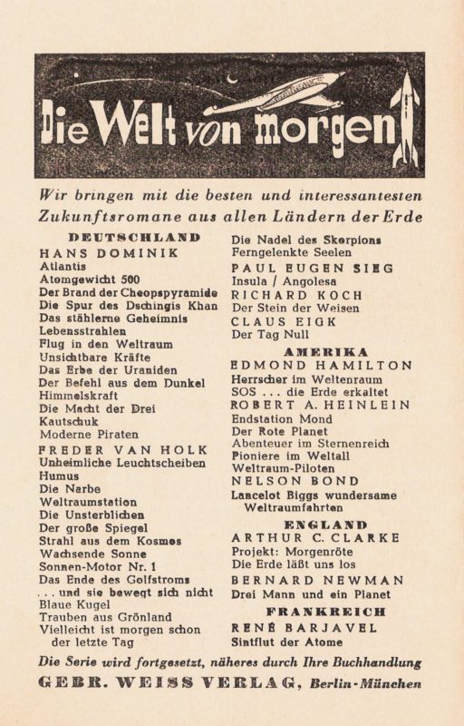 [ DEA | o. J. (1953) | 291+1=292 S. | 19,5 x 13,5 cm | Orangeroter (auch: beigegelber) Leinenband mit braungeprägter Deckelvignette und Rückentitel, mit farbig illustriertem Schutzumschlag: DM 7,80 ++ grauer Halbleinenband m. SU: DM 6,80 | Reihe "Die Welt von morgen im Roman von heute · Zukunftsromane aus aller Welt" | Der Name des Autors ist auf dem Schutzumschlag falsch mit "Bernard Newmann" angegeben ] =+