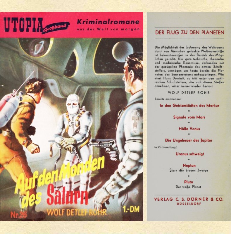 WOLF DETLEF ROHR[ (1928-1981) · alias Wayne Coover · alias Allan Reed ]AUF DEN MONDEN DES SATURN[ Serie "Der Flug zu den Planeten" (auch: "Sugar Pearson") # 5 ]Charmaine, Sugar Pearsons reizvolle Frau, wird von brutalen Gangstern gekidnappt und in ein geheimnisvolles weißes Haus in der Nefudwüste Arabiens gebracht. Springfield, der tapfere Kamerad auf allen Weltraumexpeditionen, teilt ihr Schicksal. Im Fernen Osten steigen zwei, im Nahen Osten ein drittes Weltraumschiff auf. Ihr Ziel ist unzweifelhaft der Saturn, auf dessen Monden Diamantfelder von ungeahnter Größe und mächtige Uranvorkommen entdeckt wurden. Charmaine und Springfield kennen das Geheimnis, und man wird alles tun, um sie zum Sprechen zu bringen, alles ---.Eine mächtige Geheimorganisation, brutale Gangster, Männer, die bei den höchsten Behörden ein- und ausgehen, das sind die Gegner. Übereilt entschließt sich Albertus zu einem neuen Saturnflug. Springfield befreit sich, aber wo bleibt Charmaine? Warum verschwindet Dr. Carr wenige Stunden vor dem Start von der Basis Nevada Field? Zwischen den Monden des Saturn wird mit furchtbarer Unerbittlichkeit ein Kampf fortgesetzt, der auf der Erde begonnen hat. Und Sugar Pearson, Chefreporter der "New World", denkt diesmal nicht an seine Berichte, nur an Rache für seine Charmaine ---!Impressum (der Leinen-Ausgabe): © 1954 by Verlag C. S. Dörner & Co., Düsseldorf · 1.-2. Tausend der Gesamtauflage · Umschlagzeichnung: Karl Stephan, München · Gesamtherstellung: Meixner & Polak, Krefeld-Fischeln.VERLAG C. S. DÖRNER & CO. · DÜSSELDORF[ OA | 1954 · (1.-5. Tsd.) | 287 S. | 18,5 x 12,5 | Ln m. farb. ill. SU (1.-2. Tsd.): DM 7,80 ++ Farb. ill. Supronyl (3.-5. Tsd.): DM 6,80 | Serie "Der Flug zu den Planeten" | Mit Werbung für diese Serie auf der rechten Umschlagklappe (siehe Cover 2 rechts) und auf Seite 288 ] +[ TG Katalog-81 | Illmer-215 | Serowy # 1032-9 | dnb+ ]Publisher's Blurb (Erich Pabel Verlag):